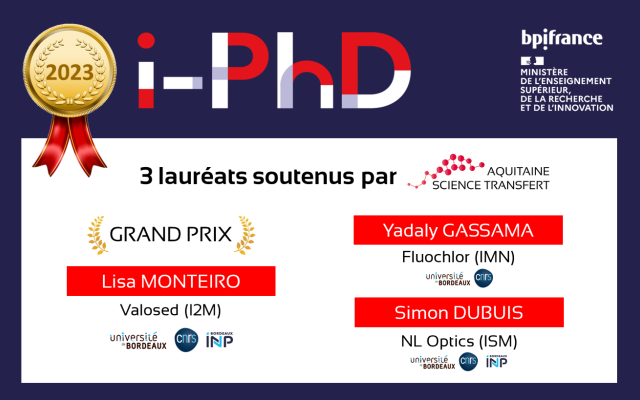 Pour sa première édition, le concours d’innovation i-PhD organisé par le Ministère de l’Enseignement Supérieur, de la Recherche et de l’Innovation et par Bpifrance, récompense trois jeunes docteurs néo-aquitains, porteurs des projets de création d’entreprise. Accompagnés notamment par la SATT Aquitaine Science Transfert, ces trois projets à fort potentiel sont également portés par le consortium Aquitaine French Tech Seed qui va assurer un vrai continuum dans l'accompagnement de la création de ces trois start-up Deeptech en région.